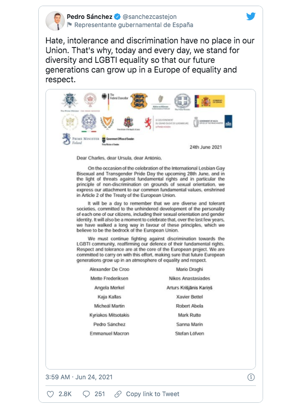 Publicada por el primer ministro español en su cuenta oficial en Twitter, la carta se emite horas antes de la cumbre de dos días de jefes de Estado y de Gobierno que comienza hoy en Bruselas, con la polémica generada por la ley de Hungría que prohíbe hablar de homosexualidad en los colegios y en los medios de comunicación, y que se perfila como uno de los temas a debate entre los Veintisiete de la UE.