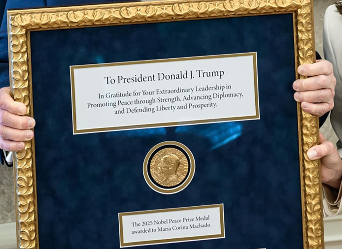 La opositora venezolana utilizó un marco con detalles dorados para colocar la medalla del Nobel que obsequió al presidente y en la parte superior escribió: «en gratitud por su extraordinario liderazgo para promover la paz» y agregó que es un detalle del pueblo venezolano por sus acciones para encaminar «su libertad», de acuerdo con fotos de la entrega en la Casa Blanca, difundidas por el New York Post.