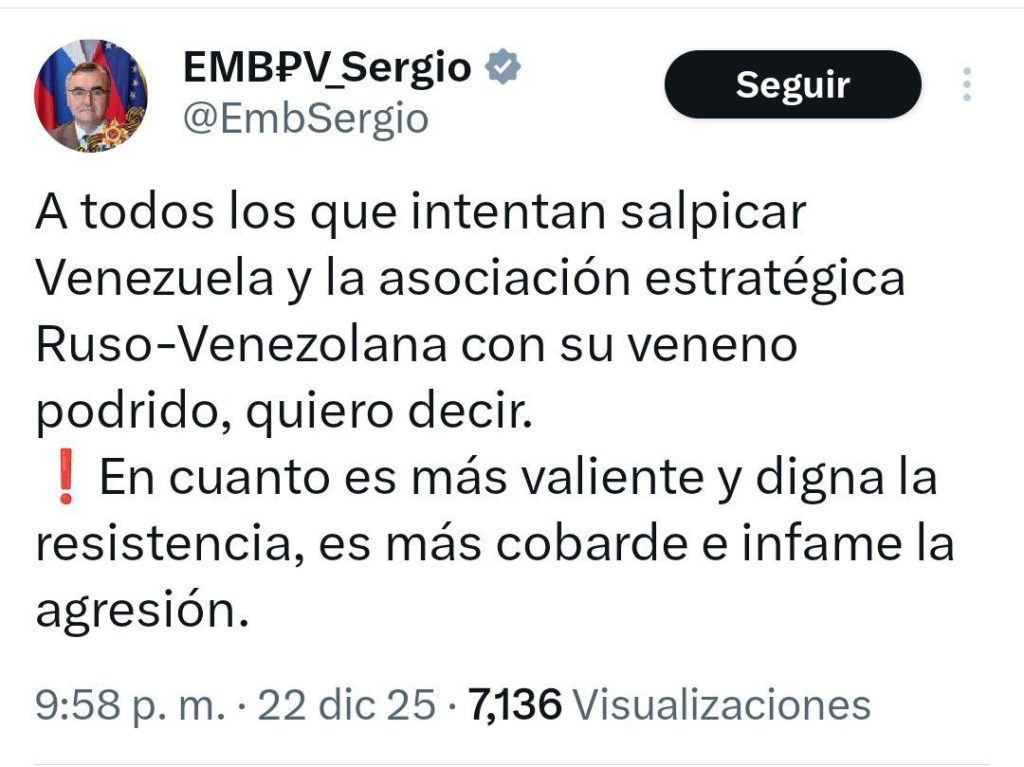 A través de su cuenta oficial en la red social X, el diplomático ruso calificó estas operaciones mediáticas como un «veneno podrido», en el que señaló que forman parte de una estrategia de desinformación destinada a generar incertidumbre, aislar a Venezuela y erosionar los vínculos políticos y geopolíticos entre ambos Estados.