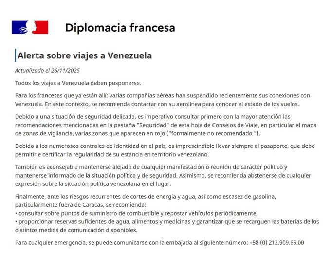 El aviso está dirigido tanto a quienes planean visitar Venezuela como a los franceses ya residentes en la nación. Se menciona que varias aerolíneas han suspendido conexiones con el país, sugiriendo que los viajeros consulten directamente con las compañías aéreas sobre el estado de los vuelos.