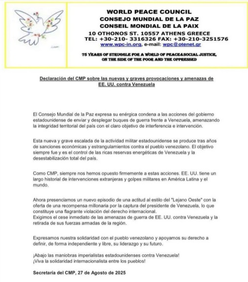 El Consejo Mundial de la Paz (CMP) condenó las acciones del gobierno estadounidense de enviar y desplegar buques de guerra frente a Venezuela, acción que representa una amenaza a la integridad territorial.