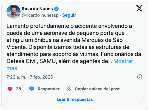 El alcalde de São Paulo, Ricardo Nunes, lamentó el accidente y afirmó en redes sociales que había puesto a disposición todas las estructuras del Ayuntamiento para atender a las víctimas.