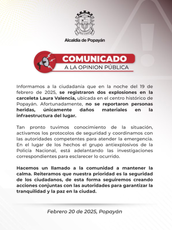 En la Alcaldía de la capital caucana emitieron un comunicado con el confirmaron que no hubo personas afectadas por el nuevo atentado y aseveraron que el orden público se había retomado en esa ciudad del suroccidente colombiano.