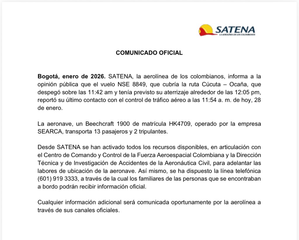 La aerolínea estatal colombiana SATENA emitió este miércoles 28 de enero un comunicado oficial informando sobre la desaparición de una de sus operaciones en el departamento de Norte de Santander. Se trata del vuelo NSE 8849, el cual perdió comunicación con las autoridades aeronáuticas durante el mediodía de hoy (28 de febero).