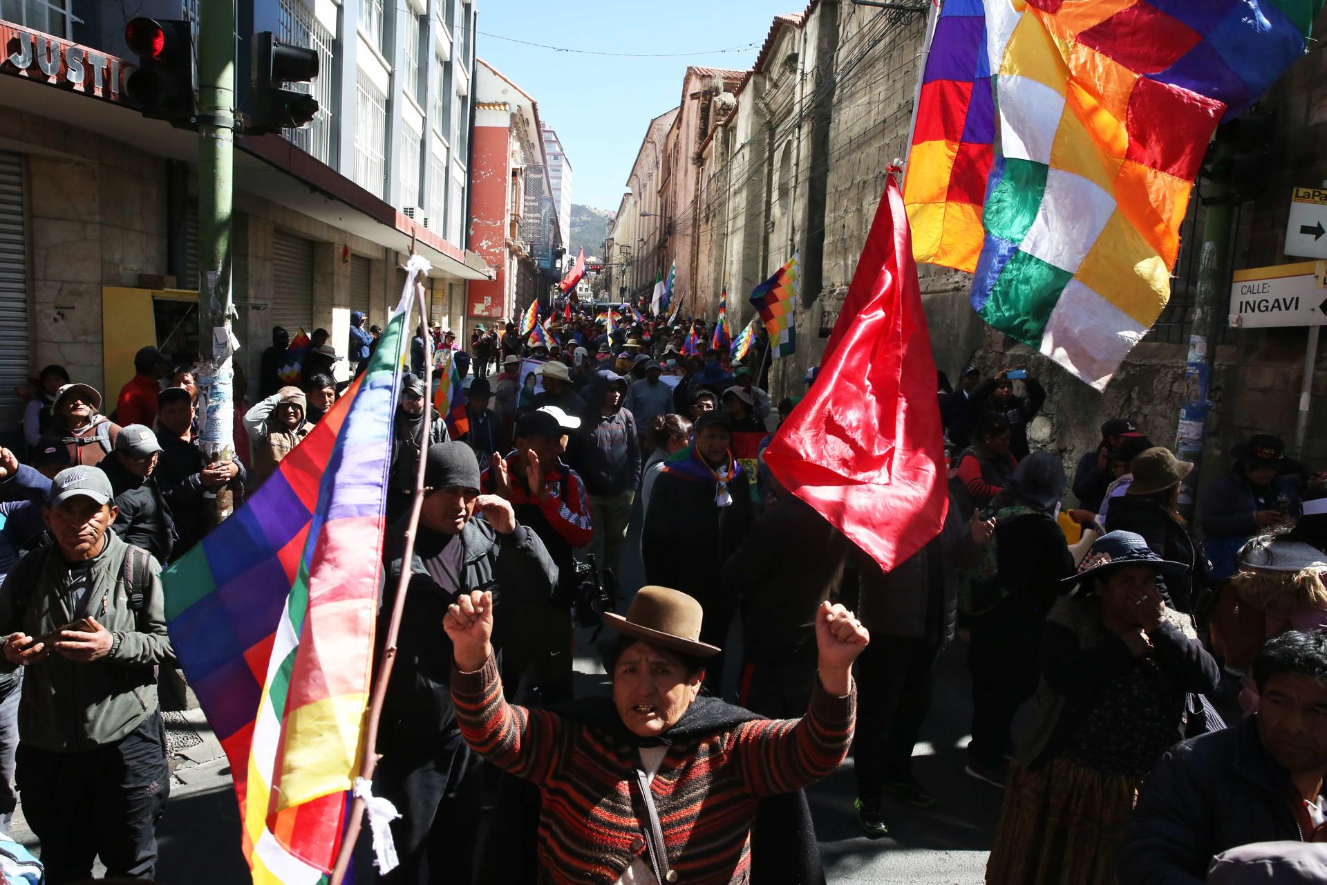 Con banderas bolivianas y también la wiphala, la enseña multicolor indígena, los movilizados corearon consignas en contra de Arce.