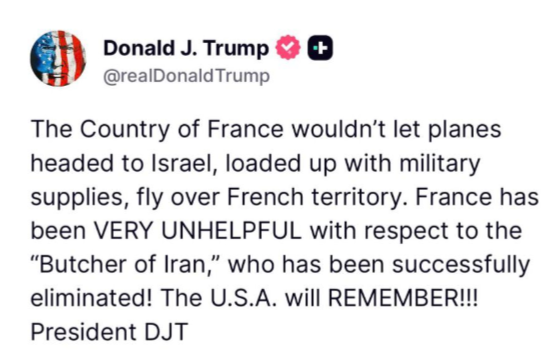 A través de una publicación en su red social Truth Social, Trump afirmó que el gobierno francés se negó a permitir el sobrevuelo de aviones estadounidenses que transportaban suministros militares con destino a Israel.
