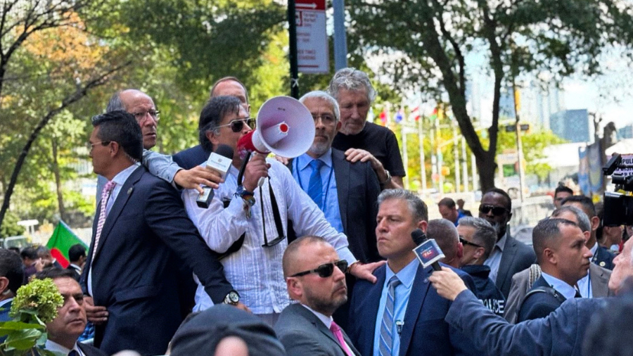 El presidente de Colombia, Gustavo Petro, participa este en las multitudinarias marchas en contra de Israel y el Gobierno de Benjamín Netanyahu, que se registran en Nueva York, EE.UU., en rechazo al «genocidio» de la población de Palestina en Gaza.