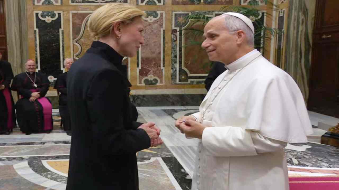 La actriz australiana Cate Blanchett visitó este sábado el Vaticano junto a otras celebridades y, al término de una audiencia «inspiradora» con el papa León XIV, le regaló una pulsera solidaria con los refugiados.