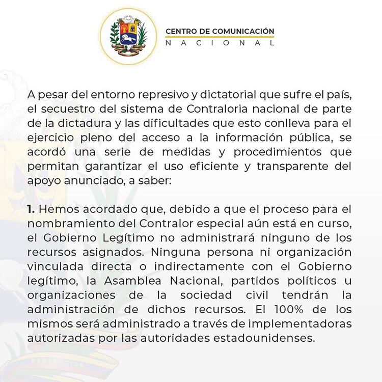 Un comunicado emitido por el organismo explica que «para garantizar la efectividad y transparencia» los fondos serían administrados por «organizaciones internacionales». Además, «su contraloría será realizada por autoridades de EE.UU.»
