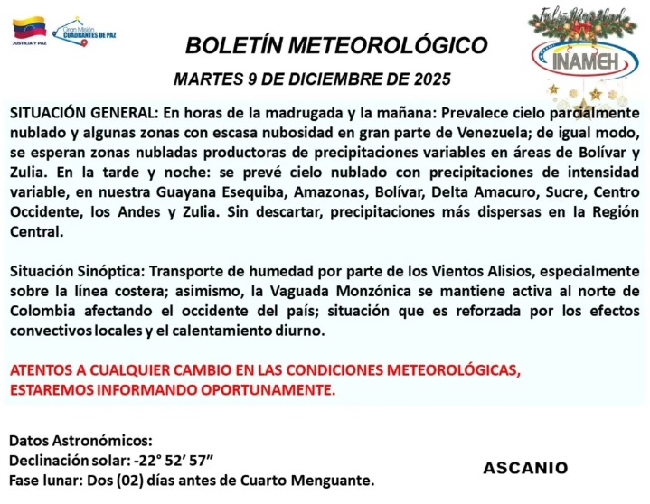 De igual forma, el Inameh indica que en la tarde y noche se prevé cielo nublado con Lluvias de intensidad variable, en la Guayana Esequiba, Amazonas, Bolívar, Delta Amacuro, Sucre, Centro Occidente, los Andes y Zulia. Sin descartar, precipitaciones más dispersas en la Región Central.