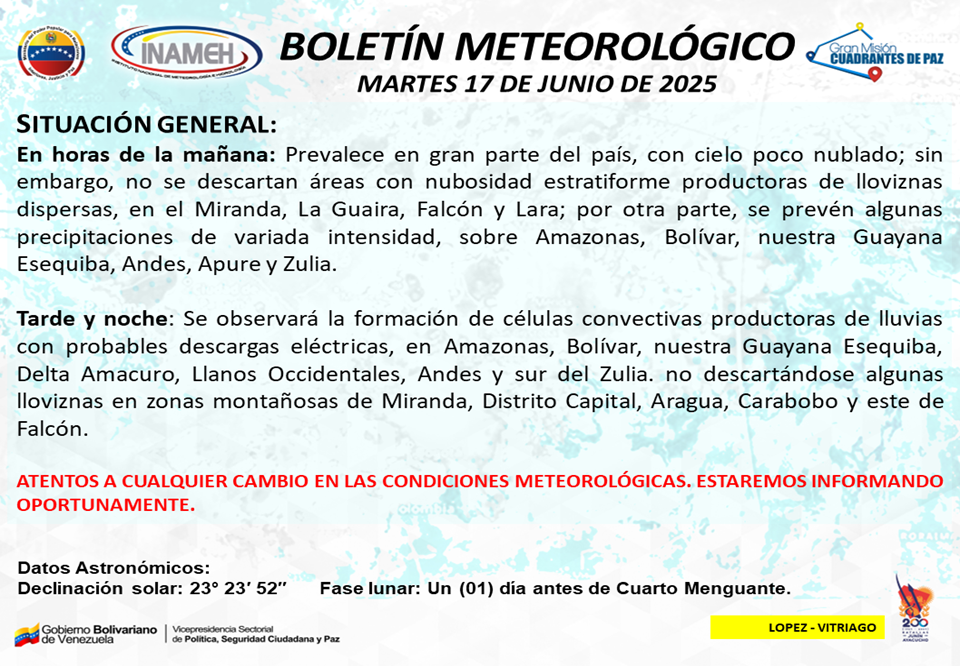 Este martes 17 de junio en horas de la mañana prevalece cielo poco nublado en gran parte del país; sin embargo, no se descartan áreas con nubosidad estratiforme productoras de lloviznas dispersas, en el estado Miranda, La Guaira, Falcón y Lara; al tiempo que se prevén algunas precipitaciones de variada intensidad, sobre Amazonas, Bolívar, la Guayana Esequiba, Andes, Apure y Zulia, informó el boletín del Instituto Nacional de Meteorología e Hidrología (Inameh).