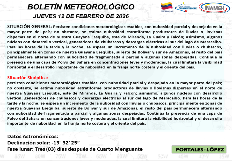 De acuerdo con el boletín oficial emitido por el Instituto Nacional de Meteorología e Hidrología (INAMEH), Venezuela presenta para este jueves condiciones meteorológicas mayormente estables. Se reporta un predominio de cielos despejados y nubosidad parcial en gran parte del territorio nacional.