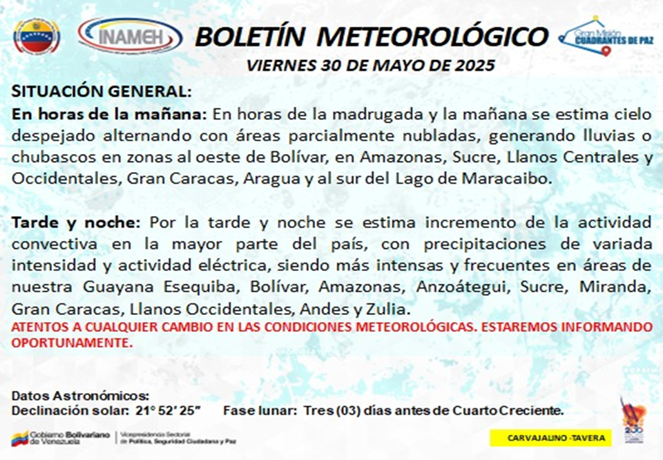 De igual forma, el Inameh señala que por la tarde y noche se espera incremento de la actividad convectiva en la mayor parte del país, con precipitaciones de variada intensidad y actividad eléctrica, al ser más intensas y frecuentes en áreas de la Guayana Esequiba, Bolívar, Amazonas, Anzoátegui, Sucre, Miranda, Gran Caracas, Llanos Occidentales, Andes y Zulia.