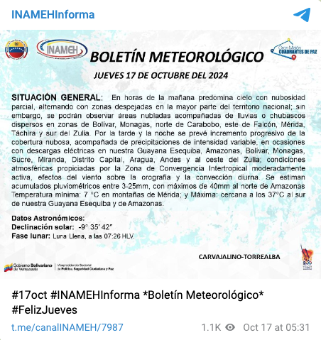 El Instituto Nacional de Meteorología e Hidrología (Inameh), en su reporte matutino, detalló que, para este jueves 17 de octubre, se prevé en horas de la mañana cielo parcialmente nublado y algunas zonas despejadas en gran parte del país; sin embargo, se podrán observar áreas nubladas acompañadas de lluvias dispersas en Bolívar, Monagas, norte de Carabobo, este de Falcón, Mérida, Táchira y sur del Zulia.