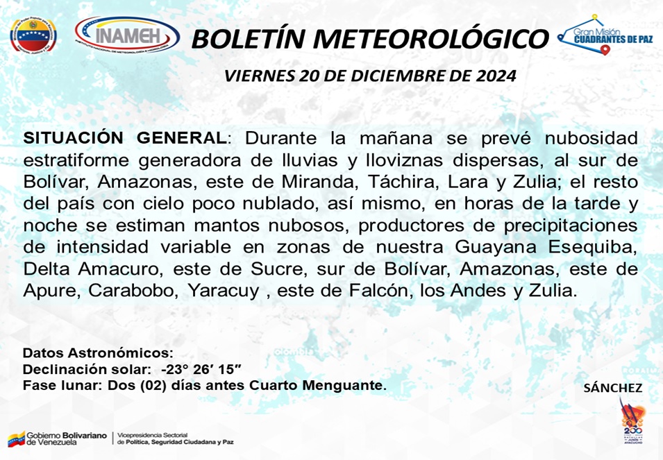El Instituto Nacional de Meteorología e Hidrología (Inameh), en su reporte matutino, detalló que, para este viernes 20 de diciembre de 2024, se prevé nubosidad estratiforme generadora de lluvias y lloviznas dispersas en gran parte del país.