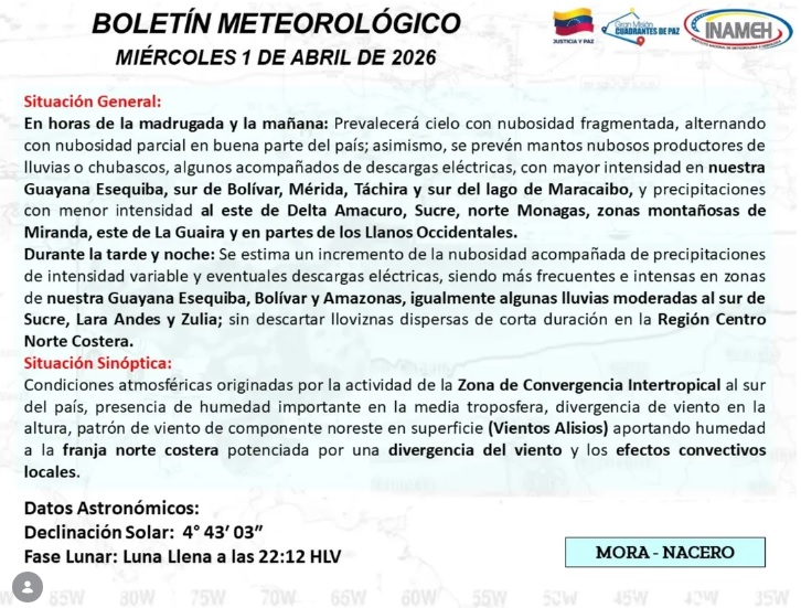 Este miércoles, en horas de la mañana, prevalecerá cielo con nubosidad fragmentada, al alternar con nubosidad parcial en buena parte del país. Asimismo, se prevén mantos nubosos productores de lluvias o chubascos, algunos acompañados de descargas eléctricas, con mayor intensidad en la Guayana Esequiba, sur de Bolívar, Mérida, Táchira y sur del lago de Maracaibo.