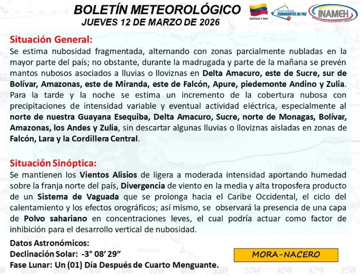De acuerdo con el boletín del Instituto Nacional de Meteorología e Hidrología (Inameh), para la tarde y la noche se estima un incremento de la cobertura nubosa con precipitaciones de intensidad variable y eventual actividad eléctrica, especialmente al norte de la Guayana Esequiba, Delta Amacuro, Sucre, norte de Monagas, Bolívar, Amazonas, los Andes y Zulia, sin descartar algunas lluvias o lloviznas aisladas en zonas de Falcón, Lara y la Cordillera Central.