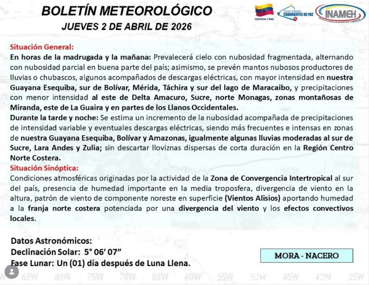 Este jueves, en horas de la mañana prevalecerá cielo con nubosidad fragmentada, al alternar con nubosidad parcial en buena parte del país. Asimismo, se prevén mantos nubosos productores de lluvias o chubascos, algunos acompañados de descargas eléctricas, con mayor intensidad en la Guayana Esequiba, sur de Bolívar, Mérida, Táchira y sur del lago de Maracaibo, y precipitaciones con menor intensidad al este de Delta Amacuro, Sucre, norte Monagas, zonas montañosas de Miranda, este de La Guaira y en partes de los Llanos Occidentales.