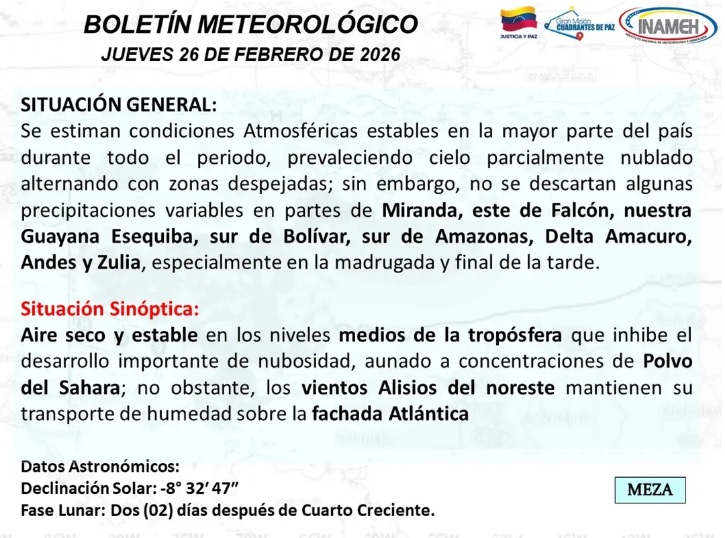 Sin embargo, no se descartan algunas precipitaciones variables en partes de Miranda, este de Falcón, la Guayana Esequiba, sur de Bolívar, sur de Amazonas, Delta Amacuro, Andes y Zulia, especialmente en la madrugada y final de la tarde.