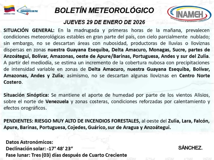 Este jueves a primeras horas de la mañana, prevalecen condiciones meteorológicas estables en gran parte del país, con cielo parcialmente nublado; sin embargo, no se descartan áreas con nubosidad, productoras de lluvias o lloviznas dispersas en zonas la Guayana Esequiba, Delta Amacuro, Monagas, Sucre, partes de Anzoátegui, Bolívar, Amazonas, oeste de Apure/Barinas, Portuguesa, Andes y sur del Zulia.