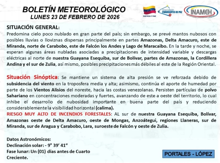 De acuerdo con el boletín del Instituto Nacional de Meteorología e Hidrología (Inameh), en la tarde y noche, se esperan algunas áreas nubladas asociadas a precipitaciones de intensidad variable y descargas eléctricas al norte de la Guayana Esequiba, sur de Bolívar, partes de Amazonas, la Cordillera Andina y el sur de Zulia. Asimismo, habrá posibles precipitaciones más débiles al este de la Región Oriental.