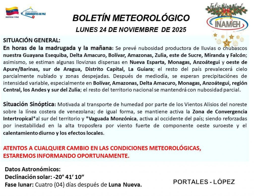La información fue publicada en el canal de Telegram de la institución, donde destacó que durante la mañana se esperan nubosidad y chubascos en Guayana, Delta Amacuro, Bolívar, Amazonas, Zulia, el este de Sucre, Miranda y Falcón. El resto del país prevalecerá con cielo parcialmente nublado y zonas despejadas.
