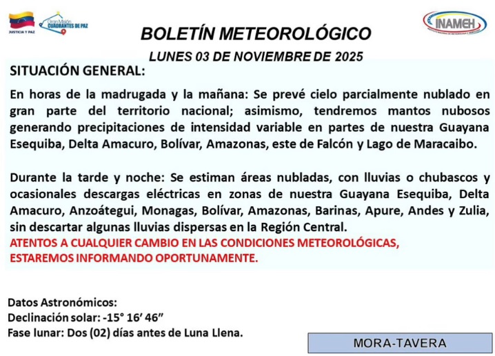 De igual forma, el Inameh señala que durante la tarde y noche se estiman áreas nubladas, con lluvias o chubascos y ocasionales descargas eléctricas en zonas de la Guayana Esequiba, Delta Amacuro, Anzoátegui, Monagas, Bolívar, Amazonas, Barinas, Apure, Andes y Zulia, sin descartar algunas lluvias dispersas en la Región Central.