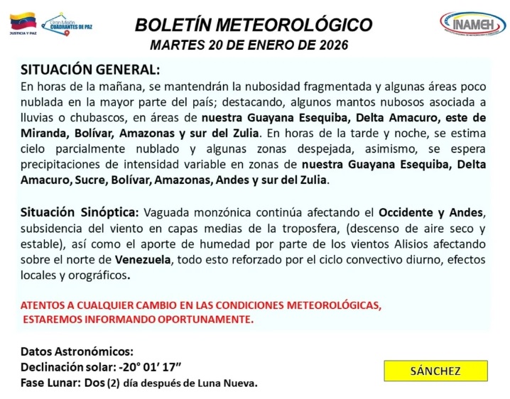 El boletín del Instituto Nacional de Meteorología e Hidrología (Inameh), señala que en horas de la tarde y noche, se estima cielo parcialmente nublado y algunas zonas despejadas. Asimismo, se esperan precipitaciones de intensidad variable en zonas de la Guayana Esequiba, Delta Amacuro, Sucre, Bolívar, Amazonas, Andes y sur del Zulia.