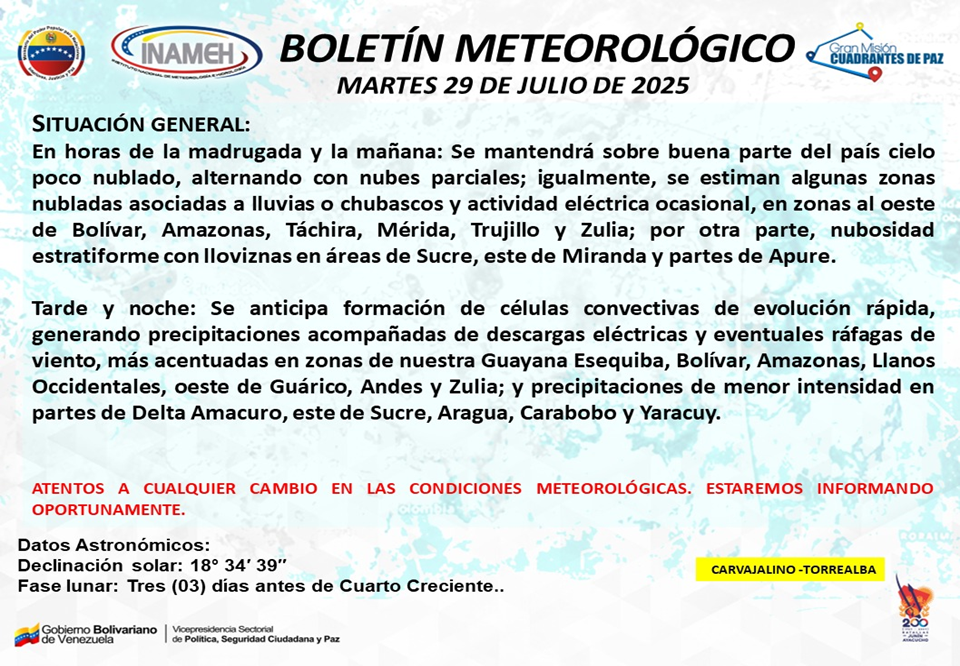 En horas de la tarde y noche se anticipa formación de células convectivas de evolución rápida, al generar precipitaciones acompañadas de descargas eléctricas y eventuales ráfagas de viento, más acentuadas en zonas de la Guayana Esequiba, Bolívar, Amazonas, Llanos Occidentales, oeste de Guárico, Andes y Zulia; y lluvias de menor intensidad en partes de Delta Amacuro, este de Sucre, Aragua, Carabobo y Yaracuy.