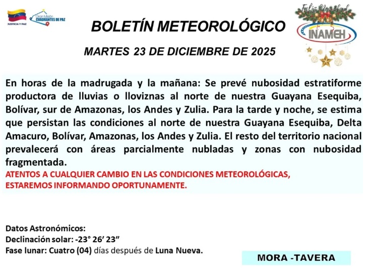 De igual forma, el Inameh señala que para la tarde y noche, se estima que persistan las condiciones al norte de la Guayana Esequiba, Delta Amacuro, Bolívar, Amazonas, los Andes y Zulia. El resto del territorio nacional prevalecerá con áreas parcialmente nubladas y zonas con nubosidad fragmentada.
