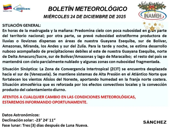 De igual forma, el Inameh señala que para la tarde y noche, se estima desarrollo nuboso acompañado de precipitaciones débiles al este de la Guayana Esequiba, norte de Delta Amacuro/Sucre, sur de Bolívar/Amazonas y lago de Maracaibo; el resto del país se mantendrá con cielo parcialmente nublado y algunas zonas con nubosidad fragmentada.