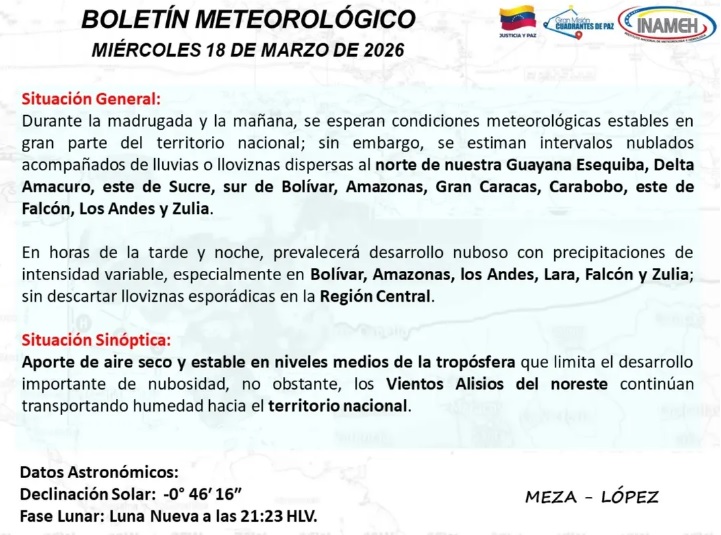Este miércoles durante la mañana se esperan condiciones meteorológicas estables en gran parte del territorio nacional; sin embargo, se estiman intervalos nublados acompañados de lluvias o lloviznas dispersas al norte de la Guayana Esequiba, Delta Amacuro, este de Sucre, sur de Bolívar, Amazonas, Gran Caracas, Carabobo, este de Falcón, Los Andes y Zulia.