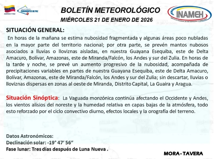 De acuerdo con el boletín de las autoridades del Instituto Nacional de Meteorología e Hidrología (Inameh), en horas de la tarde y noche, se estima un aumento progresivo de la nubosidad, acompañada de precipitaciones variables en partes de la Guayana Esequiba, este de Delta Amacuro, Bolívar, Amazonas, este de Miranda/Falcón, los Andes y sur del Zulia; sin descartar, lluvias o Iloviznas dispersas en zonas al oeste de Miranda, Distrito Capital, La Guaira y Aragua.