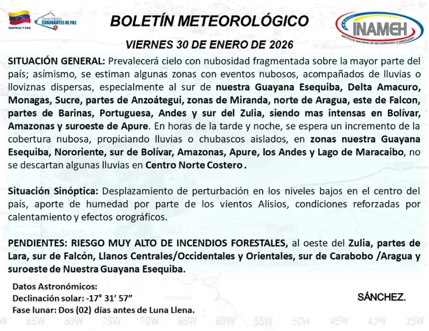 Este viernes prevalecerá cielo con nubosidad fragmentada sobre la mayor parte del país. Asimismo, se estiman algunas zonas con eventos nubosos, acompañados de lluvias o lloviznas dispersas, especialmente al sur de la Guayana Esequiba, Delta Amacuro, Monagas, Sucre, partes de Anzoátegui, zonas de Miranda, norte de Aragua, este de Falcón, partes de Barinas, Portuguesa, Andes y sur del Zulia, al ser más intensas en Bolívar, Amazonas y suroeste de Apure.
