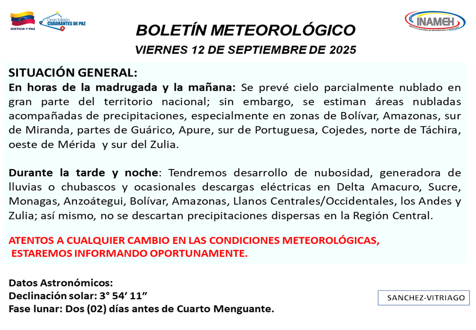 De igual forma, el Inameh señala que durante la tarde y noche habrá desarrollo de nubosidad, generadora de lluvias o chubascos y ocasionales descargas eléctricas en Delta Amacuro, Sucre, Monagas, Anzoátegui, Bolívar, Amazonas, Llanos Centrales/Occidentales, los Andes y Zulia. Asimismo, no se descartan precipitaciones dispersas en la Región Central del país.
