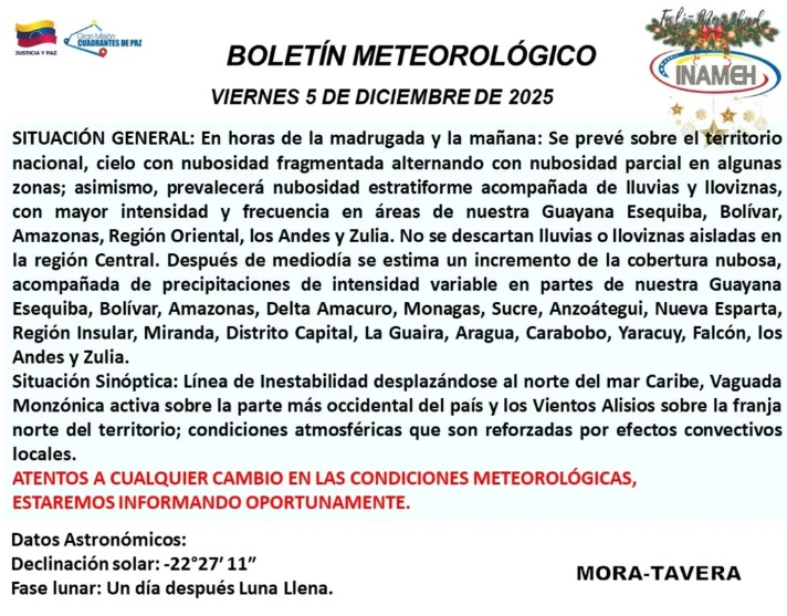 Este viernes en horas de la mañana se prevé sobre el territorio nacional, cielo con nubosidad fragmentada al alternar con nubosidad parcial en algunas zonas. Asimismo, prevalecerá nubosidad estratiforme acompañada de lluvias y lloviznas, con mayor intensidad y frecuencia en áreas de la Guayana Esequiba, Bolívar, Amazonas, Región Oriental, los Andes y Zulia, reseña el boletín de las autoridades del Instituto Nacional de Meteorología e Hidrología (Inameh).