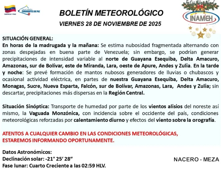 En horas de la mañana se estima nubosidad fragmentada al alternar con zonas despejadas en buena parte de Venezuela; sin embargo, se podrían generar precipitaciones de intensidad variable al norte de la Guayana Esequiba, Delta Amacuro, Amazonas, sur de Bolívar, este de Miranda, Lara, oeste de Apure, Andes y Zulia, señaló el boletín del Instituto Nacional de Meteorología e Hidrología (Inameh).