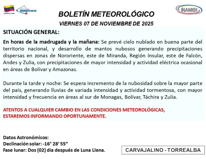 De igual forma, el Inameh señala que durante la tarde y noche se espera incremento de la nubosidad sobre la mayor parte del país, al generar lluvias de variada intensidad y actividad tormentosa, con mayor intensidad y frecuencia en áreas al sur de Monagas, Bolívar, Táchira y Zulia.