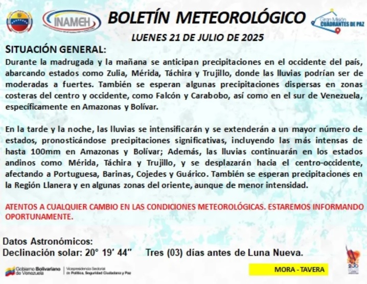 Este lunes 21 de julio durante la mañana se anticipan precipitaciones en el occidente del país, al abarcar estados como Zulia, Mérida, Táchira y Trujillo, donde las lluvias podrían ser de moderadas a fuertes, reseña un boletín del Instituto Nacional de Meteorología e Hidrología (Inameh).