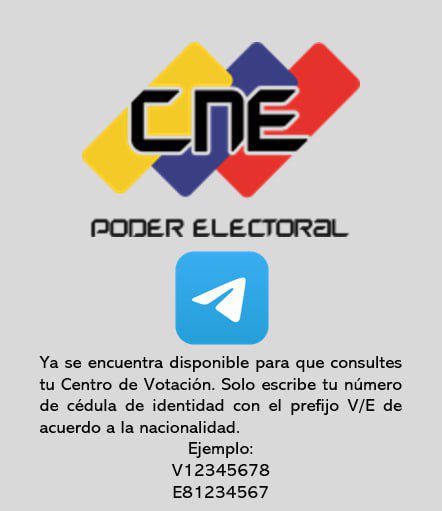 «Ya se encuentra disponible nuestro bot de Telegram Registro Electoral, donde podrás consultar de manera rápida y sencilla el centro de votación donde te corresponde votar», escribió el ente comicial en su canal de Telegram.