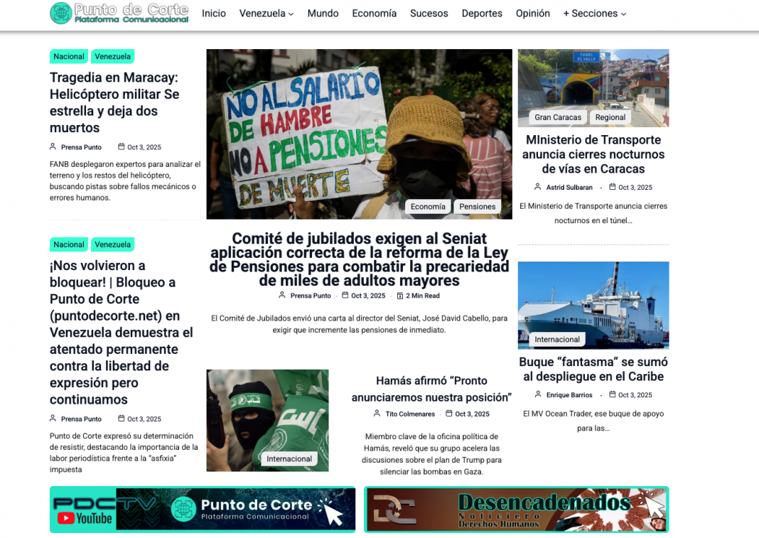 «La página del medio digital @Punto_deCorte fue bloqueada desde el #1Oct por los operadores CANTV, Movistar, Inter, Net Uno, ThunderNet, Airtek y G-Network», registró el gremio en sus redes sociales.