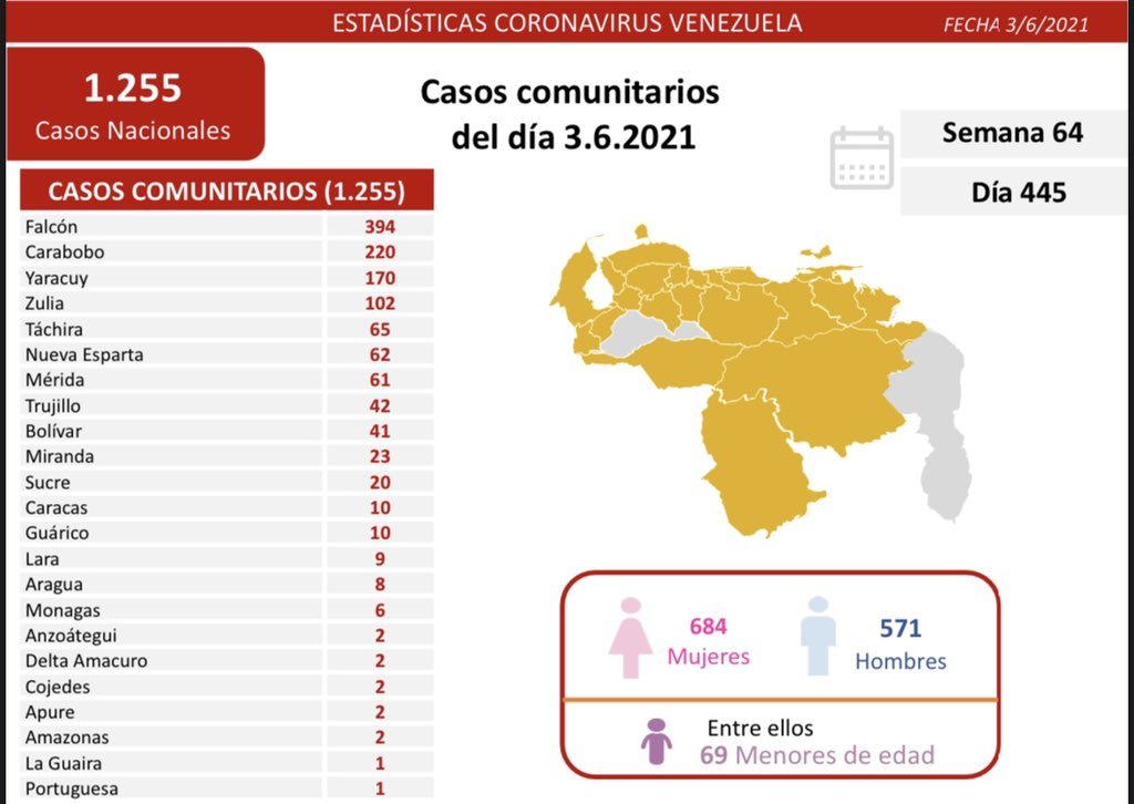 Además notificó 15 fallecidos a causa del virus en Anzoátegui (3), Barinas (3), Caracas (2), Mérida (2), Nueva Esparta (2), Lara (2), Vargas (1); el total de óbitos asciende a 2.689.