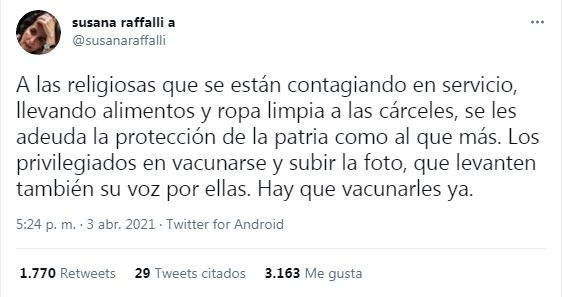 «A las religiosas que se están contagiando en servicio, llevando alimentos y ropa limpia a las cárceles, se les adeuda la protección de la patria como al que más», así lo expresó Raffalli, a través de su cuente de Twitter.