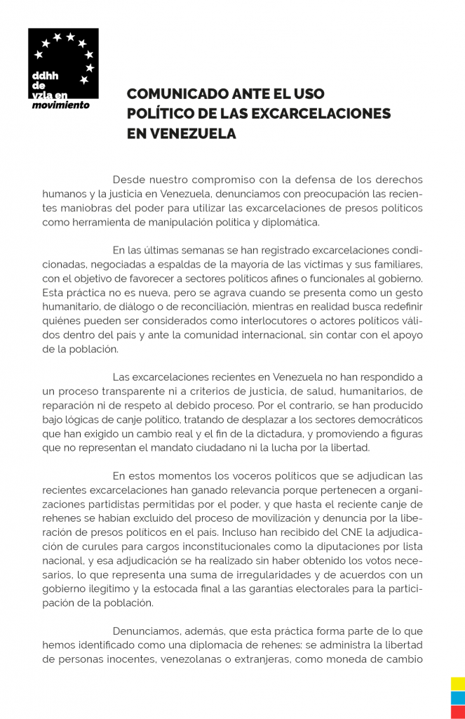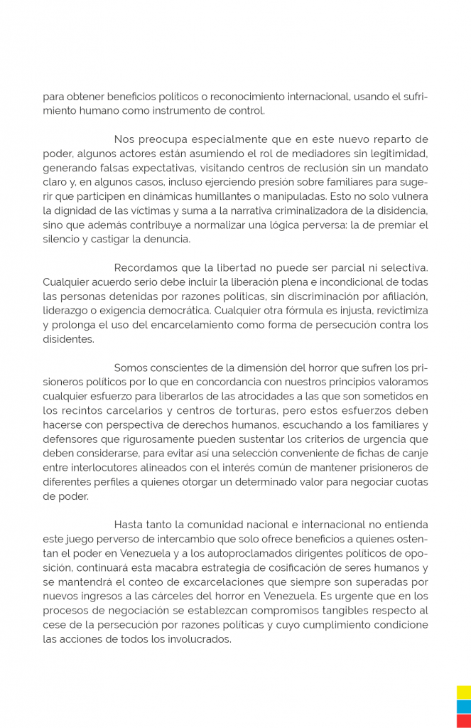 La organización afirmó que las excarcelaciones recientes «no han respondido a un proceso transparente ni a criterios de justicia, de salud, humanitarios, de reparación ni de respeto al debido proceso». Por el contrario, «se han producido bajo lógicas de canje político, tratando de desplazar a los sectores democráticos que han exigido un cambio real».