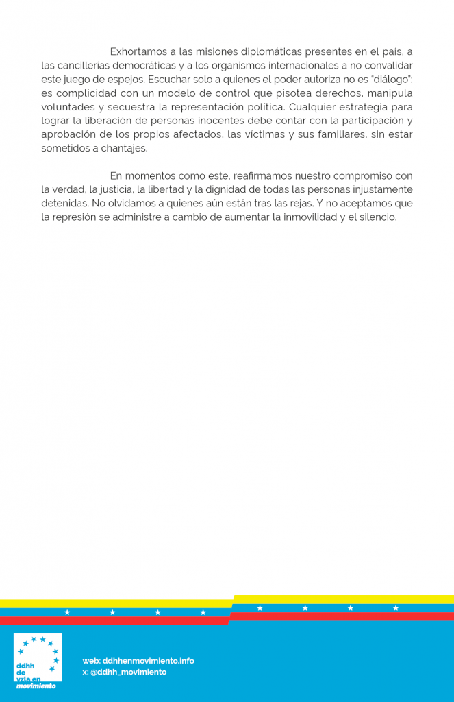 Derechos Humanos en Movimiento denunció «las recientes maniobras del poder para utilizar las excarcelaciones de presos políticos como herramienta de manipulación política y diplomática».