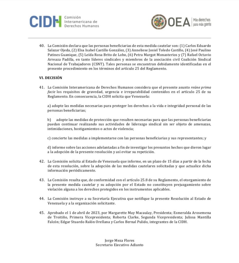 La Comisión Interamericana de Derechos Humanos aprobó medidas cautelares para Patines, lo que implica que el Estado venezolano debe adoptar medidas para proteger los derechos a la vida y la integridad personal.