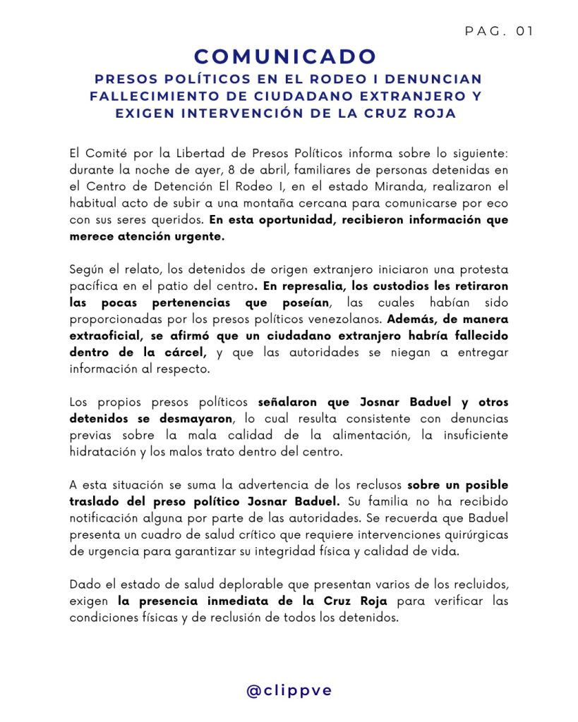 El Comité por la Libertad de Presos Políticos (CLIPPE) emitió un comunicado oficial este 9 de abril de 2026, en el que denuncia el presunto fallecimiento de un ciudadano extranjero bajo custodia en el Centro de Detención El Rodeo I. Según el reporte, la información fue obtenida de manera extraoficial a través de familiares de los detenidos, quienes mantienen comunicación con los internos mediante señales de eco desde las montañas circundantes al penal.