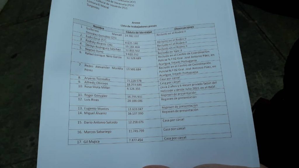 Un día después, el viernes 10 de diciembre, dirigentes gremiales, sociales y políticos se reunieron en Parque Carabobo para exigir al gobierno una Navidad sin trabajadores presos. Esta coalición calcula que hay 149 trabajadores judicializados; algunos están presos en cárceles, otros están presos en sus casas. Eduardo Sánchez, presidente del Sindicato de Trabajadores de la UCV, pide indulto o amnistía.