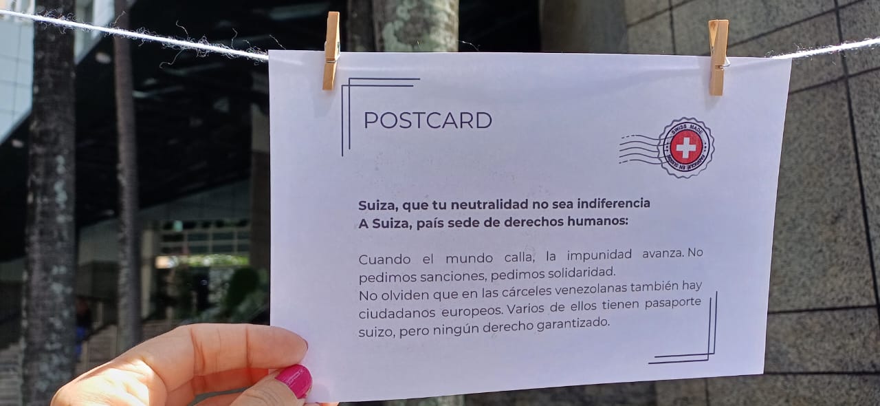 A la Embajada de Suiza se dirigieron, este martes 16 de septiembre, familiares y amigos de presos políticos para solicitar que se constaten las condiciones de reclusión de sus seres queridos. El Comité de Familiares y Amigos de los Presos Políticos de Venezuela (Clippve), como parte de la Ruta Global por la Justicia y la Libertad, manifestó en la sede diplomática, ubicada en La Castellana, a fin de llamar la atención y ganar solidaridades.