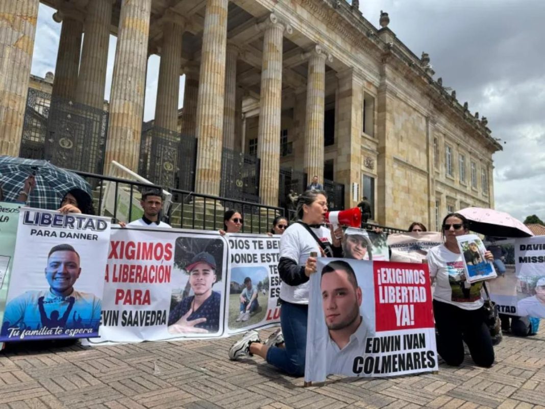 Los manifestantes, quienes se acercaron a la Casa de Nariño, desplegaron una pancarta con los rostros de los privados de libertad y destacaron que los mismos se encuentran en condición de «secuestro» en Venezuela.